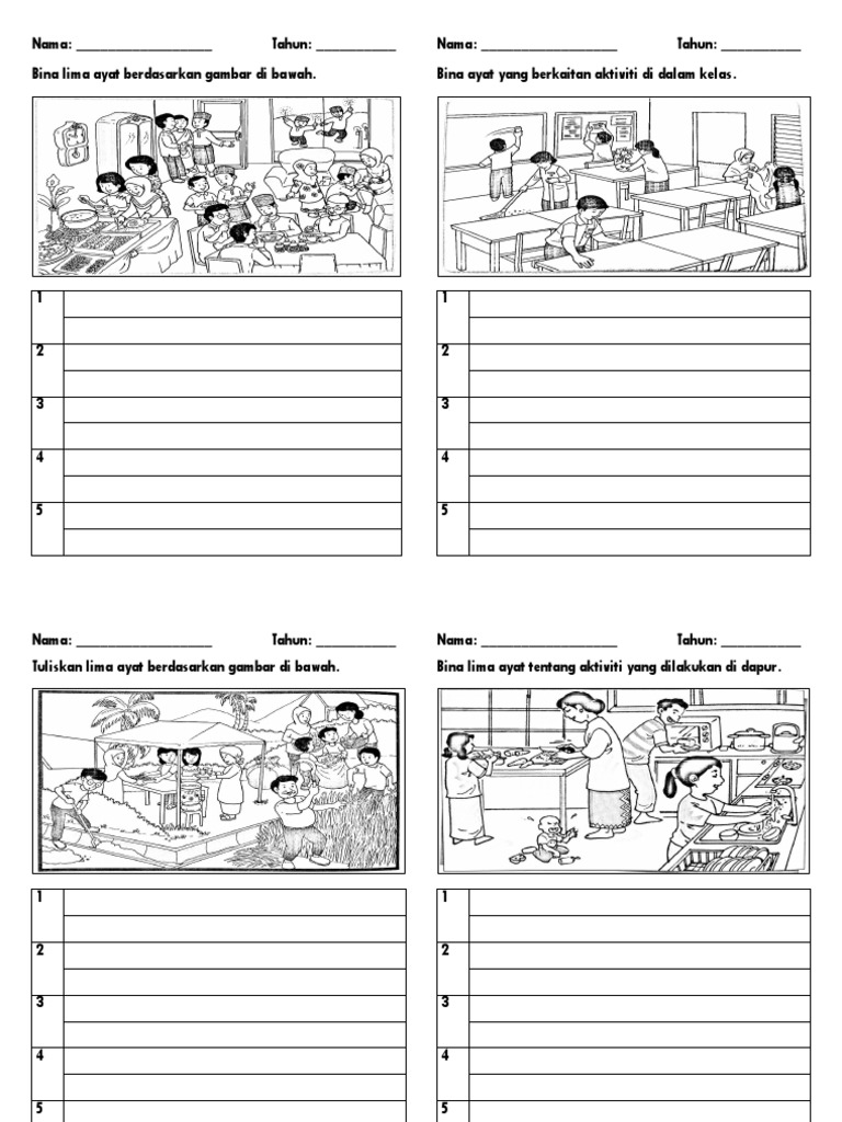 . Tahun 5 bahasa melayu upsr penulisan. Web Bina lima ayat yang lengkap berdasarkan aktiviti yang terdapat di dalam gambar. Latihan bina lima ayat berpandukan gambar tahun 6.